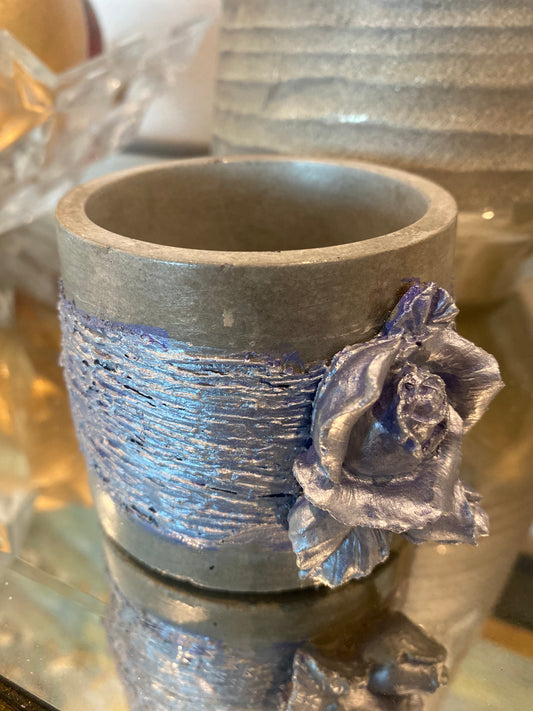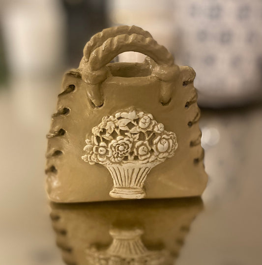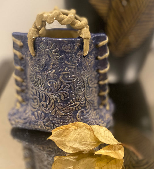Laced Elegance Handbag-Inspired Embossed Clay Vase 5.5”H x 5”W